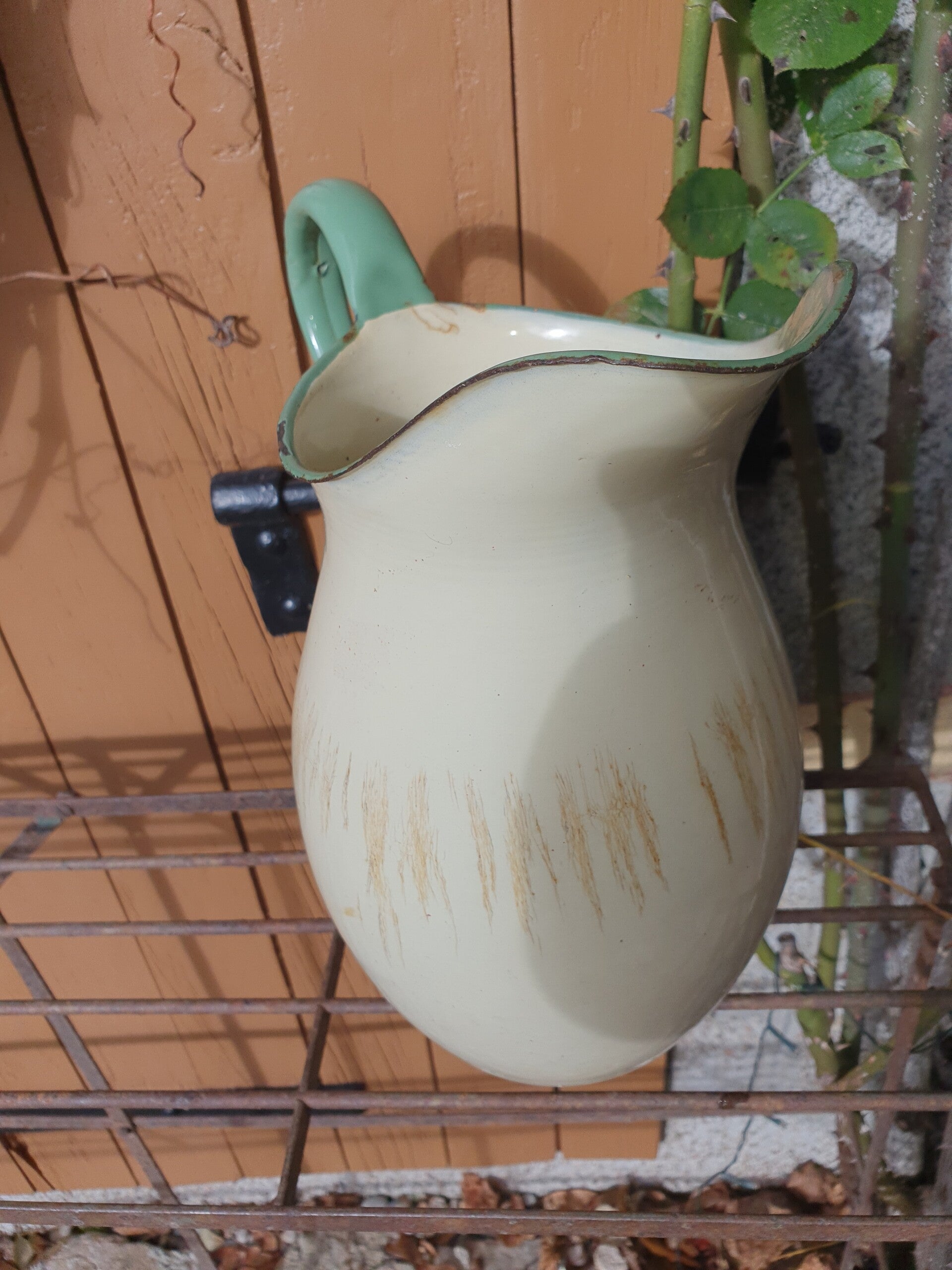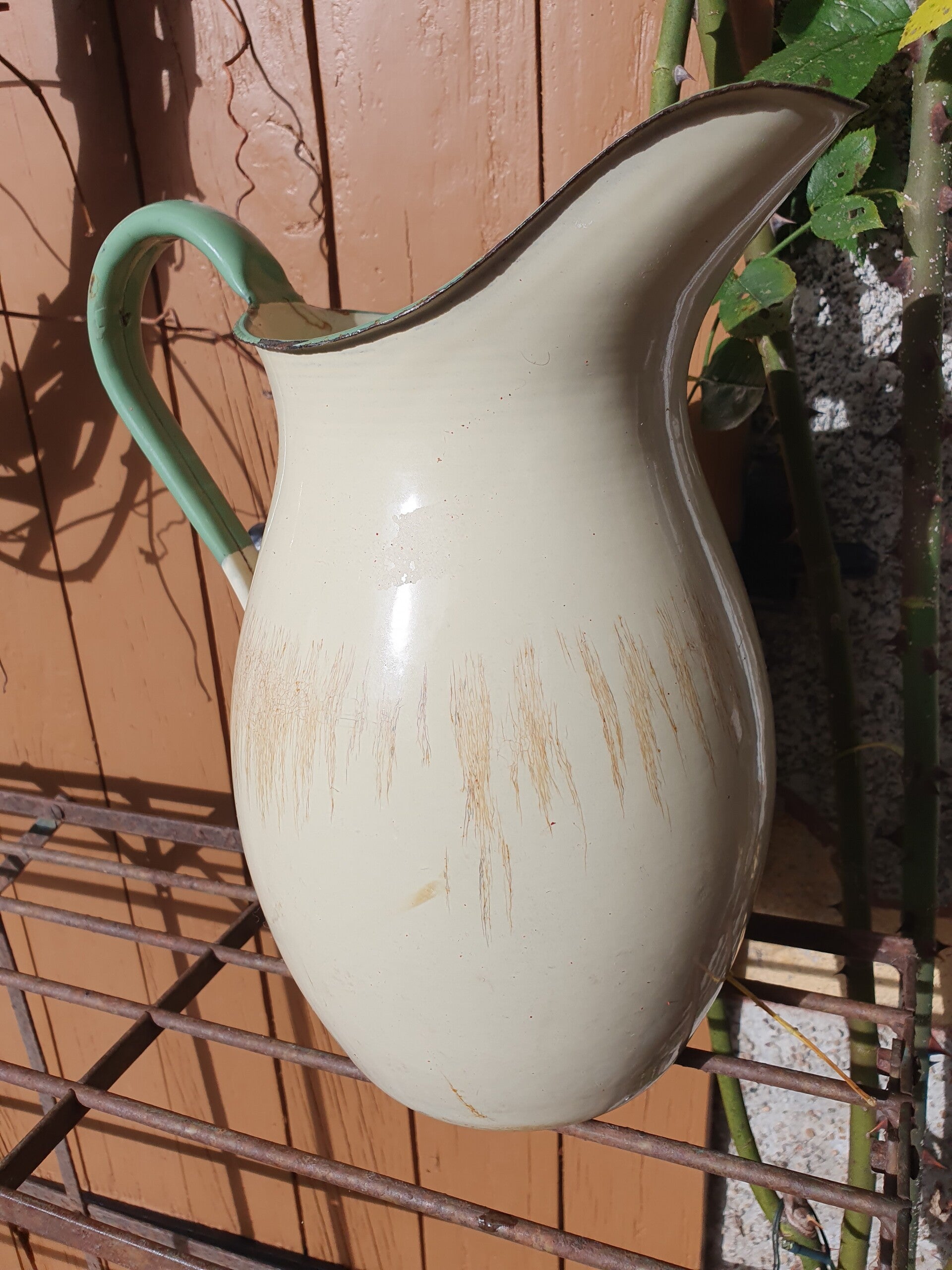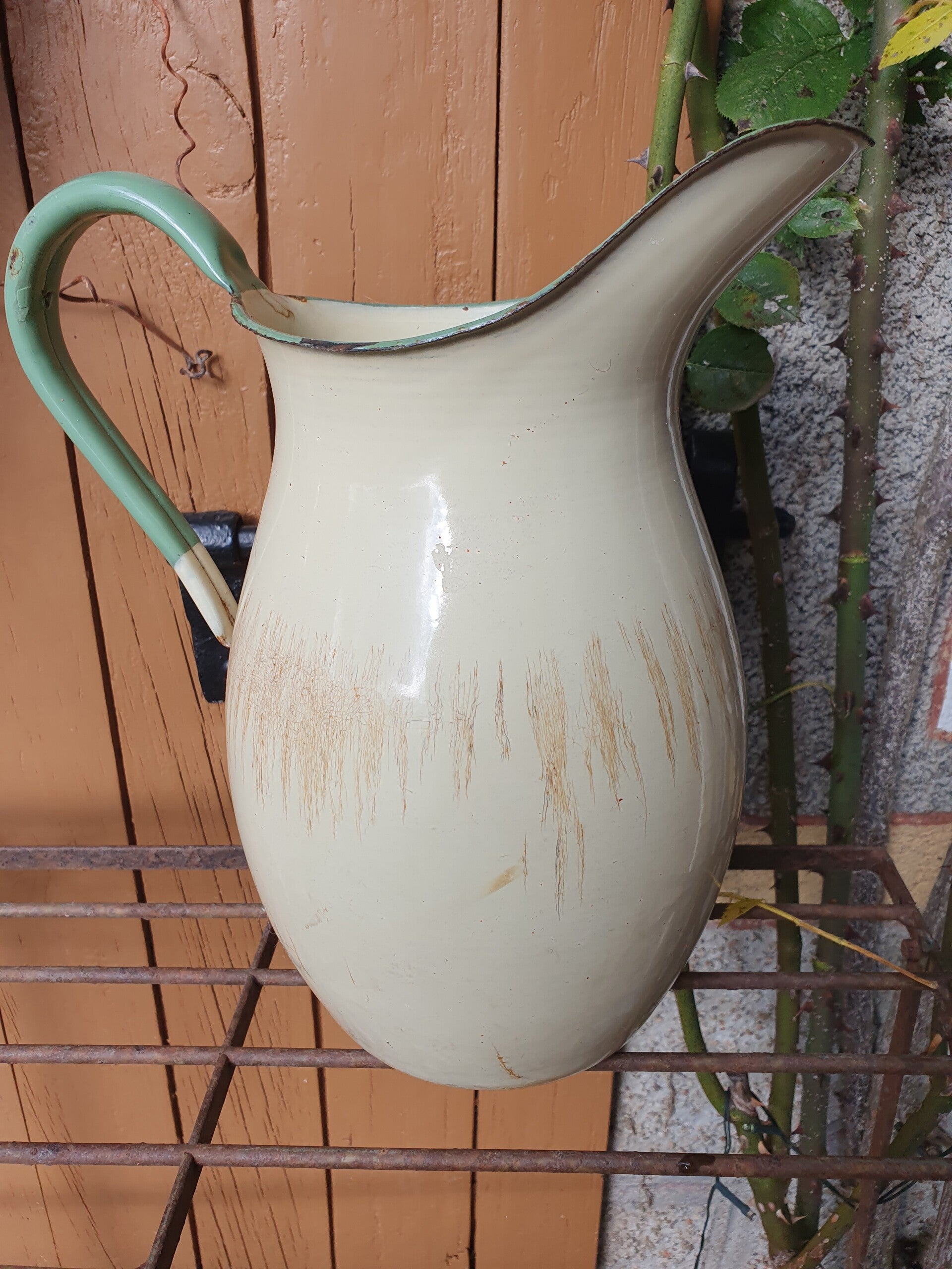 Mooie kan in ecru emaille met een reseda groene rand en handgreep.