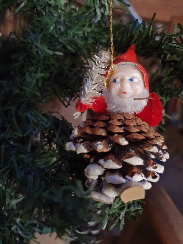 Vintage kerstmannnetje met een dennenappel lijf op skies.