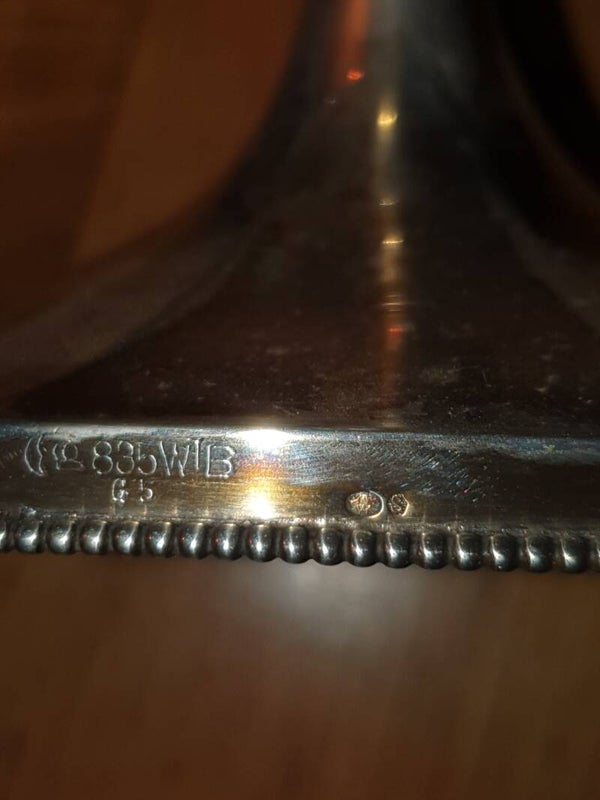Verzilverde schaal op voet met parelrand, ca 1852, gemerkt. De schaal is 16,5 cm doorsnede en 12,5 cm hoog.