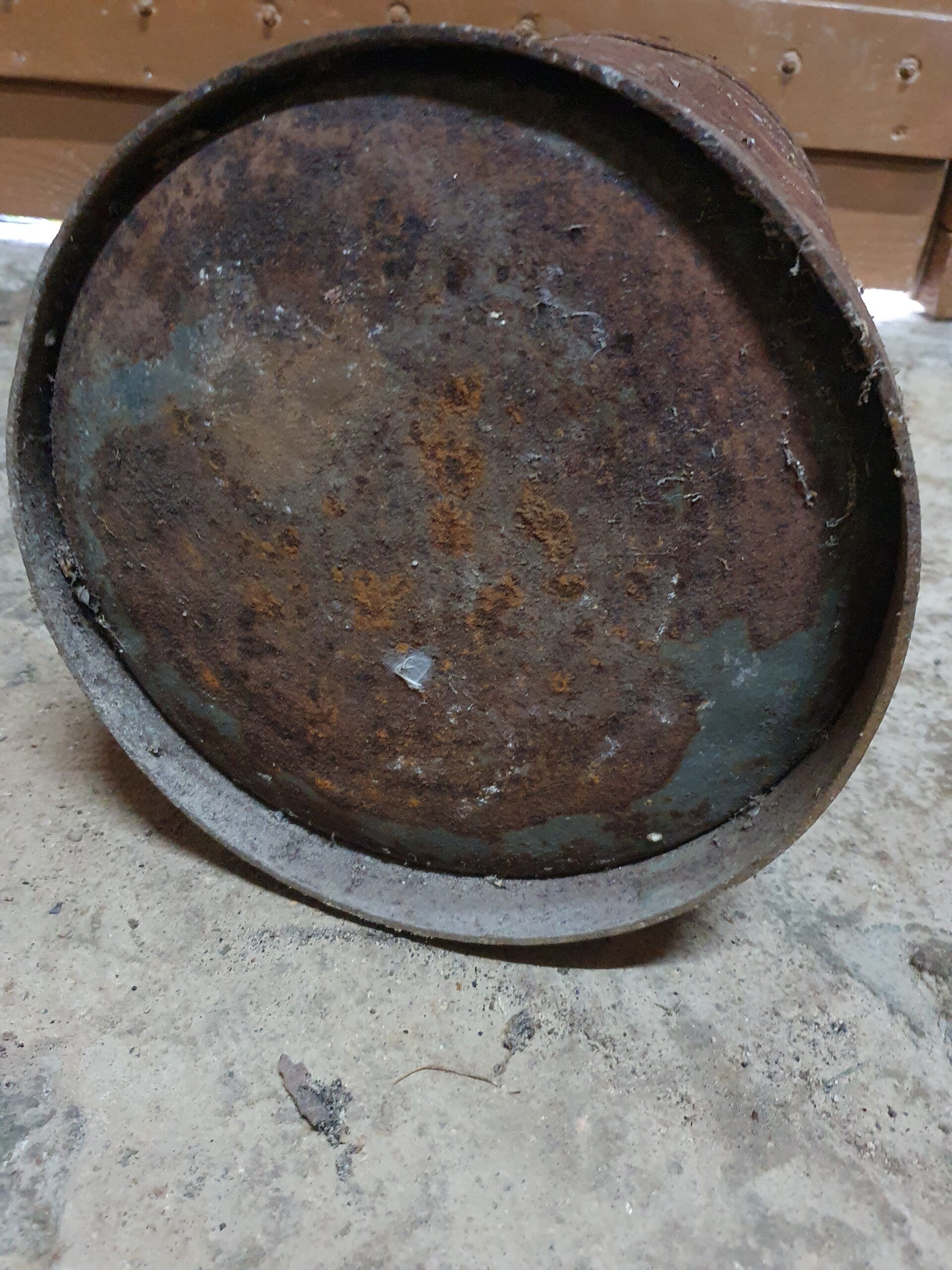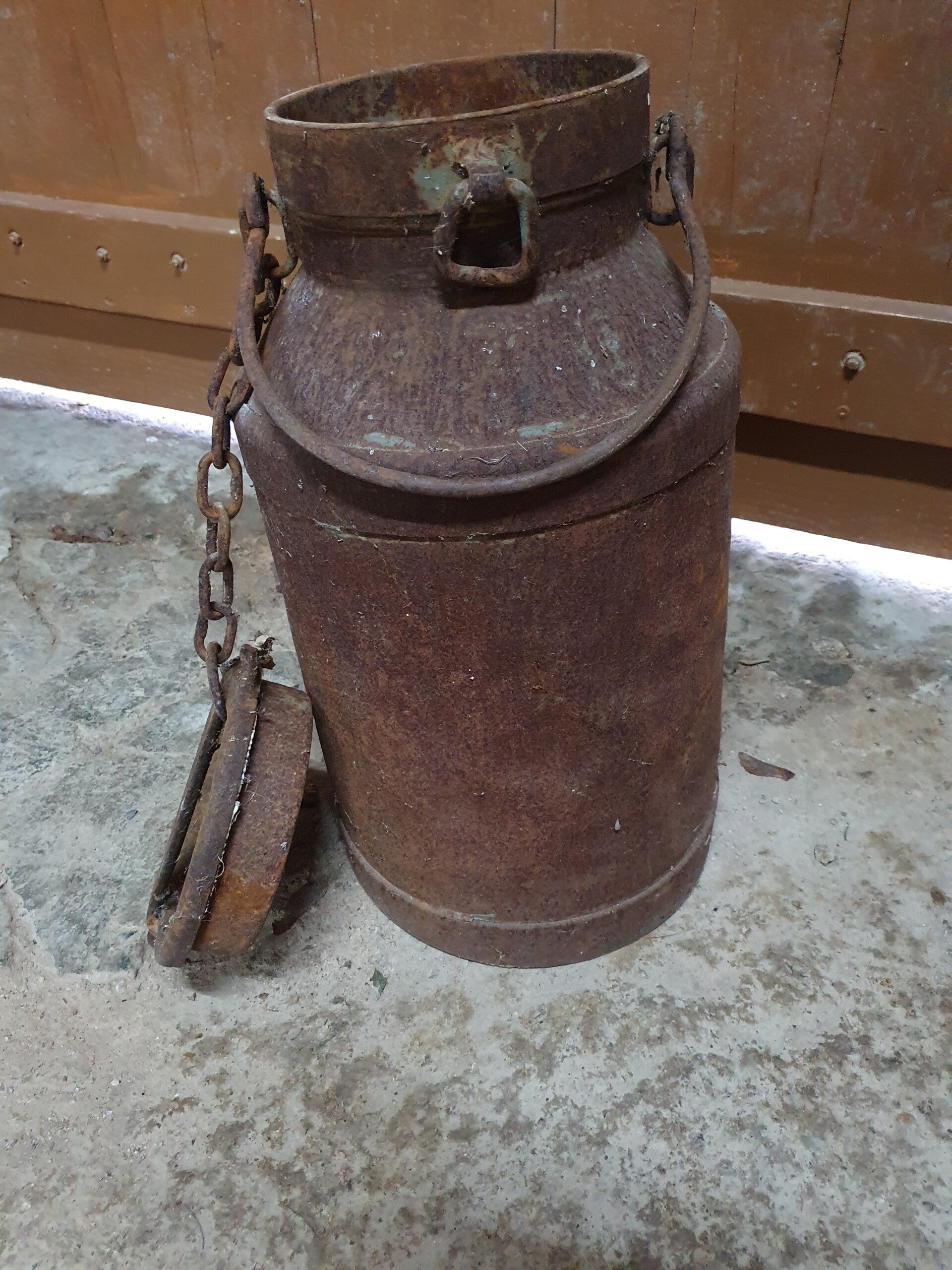 Rustieke oude franse melkbus, compleet met deksel aan een ketting van 50 cm hoog.
