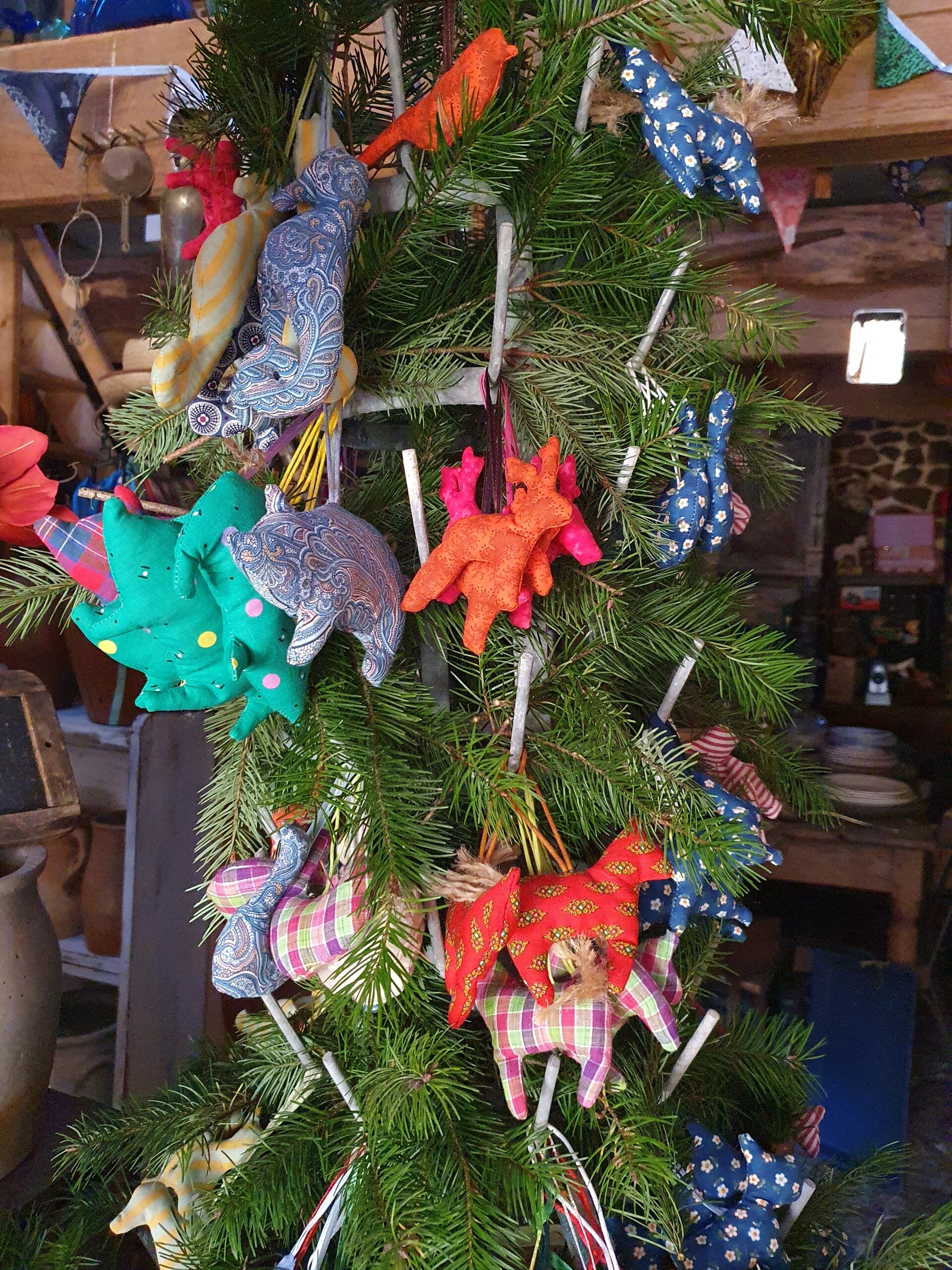 Stoffen dieren decoraties in diverse uitvoeringen o.a. varken, zeepaard, takshond, westiehond, poes, rendier, ster, engel, paddenstoel, gans, kerstboom, paardje, vogel en koekmannetje.
