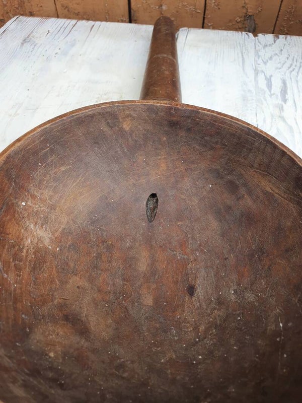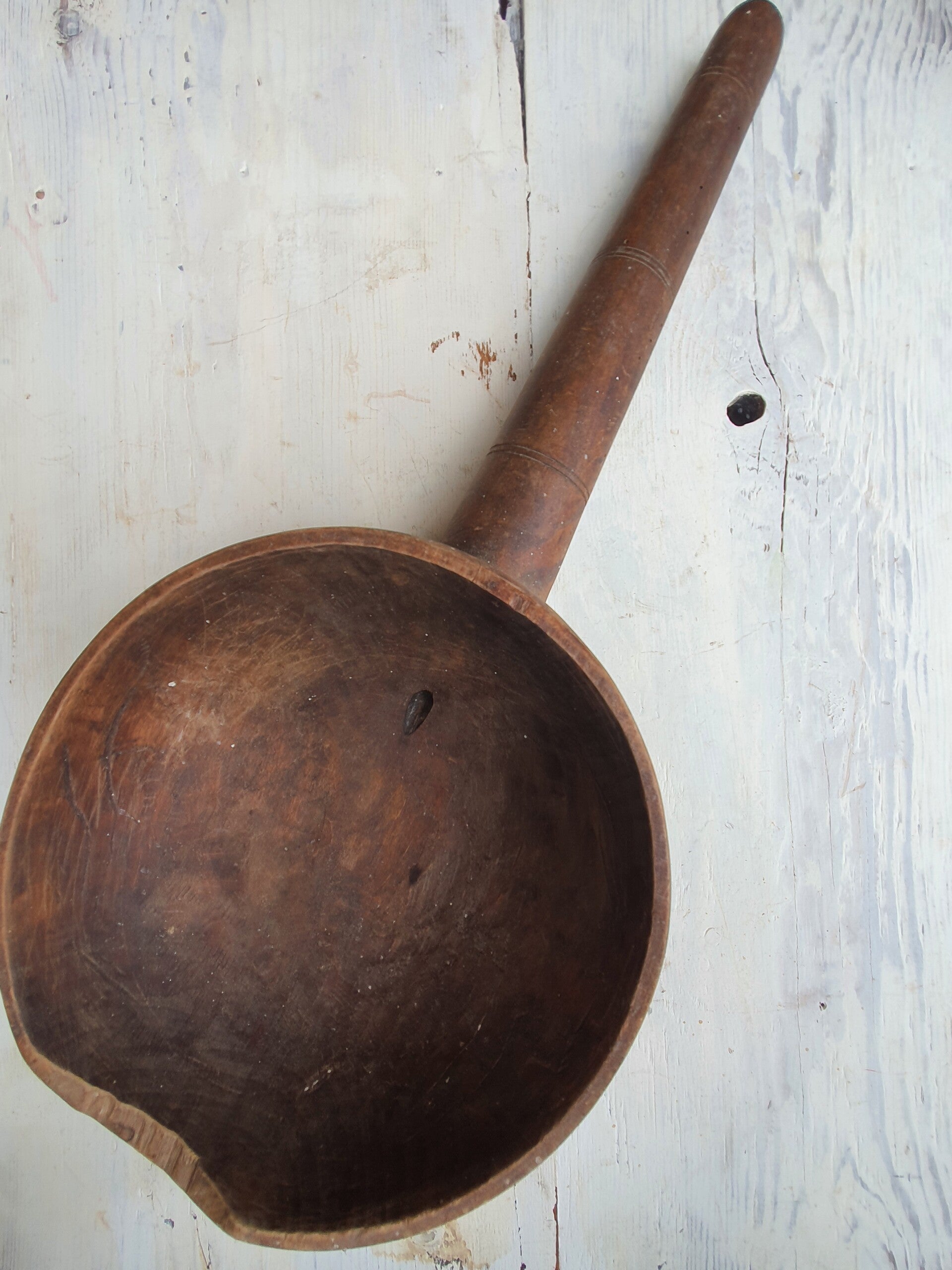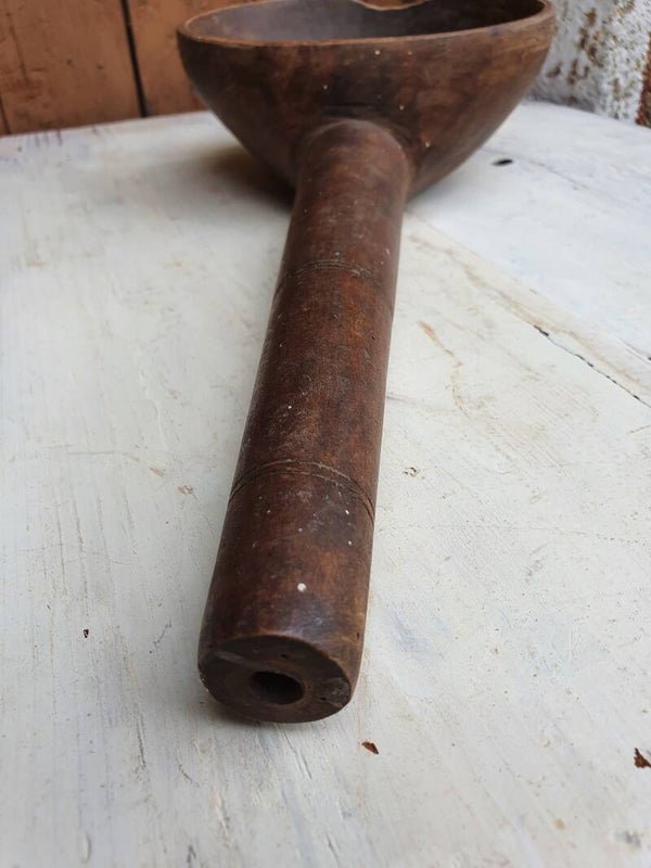 Bijzondere grote houten sap lepel, in de steel van de lepel zit een doorgang. Deze lepel stond of hing bij de dorpsbron, waar een ieder hem kon pakken. Om het hygienisch te houden, scheptje je het water in de lepel en hield je hem met afstand voor je open mond om te drinken. Leuk hè!