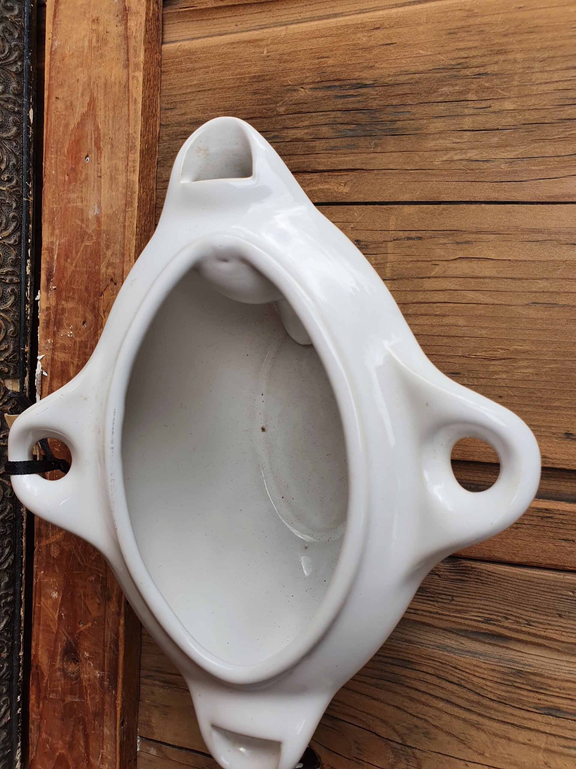 Bol à sauce française antique porcelaine séparé avec un motif floral joyeux, si vous versez le bol d'un côté, vous obtenez la sauce grasse, si vous le versez de l'autre côté, vous obtenez la sauce maigre. Sans marque.