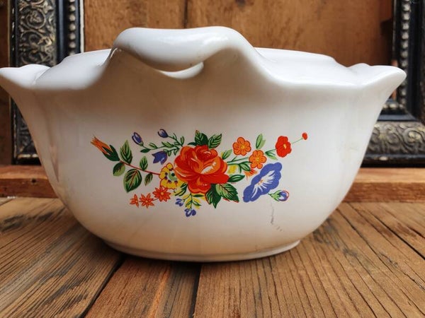 Aparte antieke franse juskomvan porcelein met vrolijk bloem design, als je de kom aan de ene kant schenkt, krijg je de vette jus, schenk je hem van de andere kant, dan krijg je de magere jus. Zonder merkteken.
