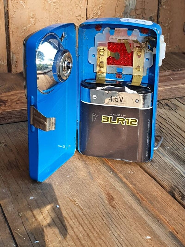 Leuke stoere vintage zaklamp met rood achterlicht en voetsteun. Werkt op 4,5V batterij.