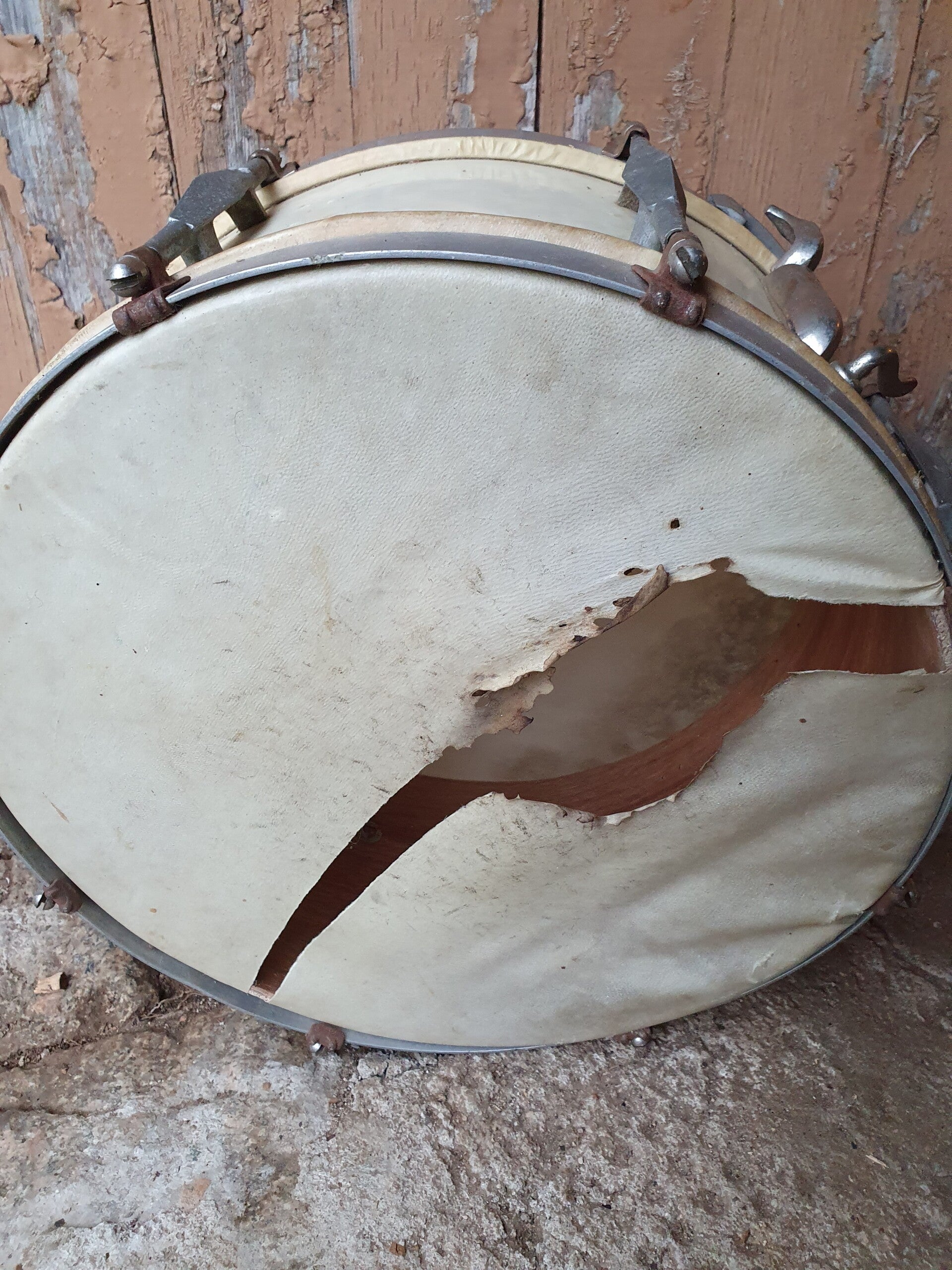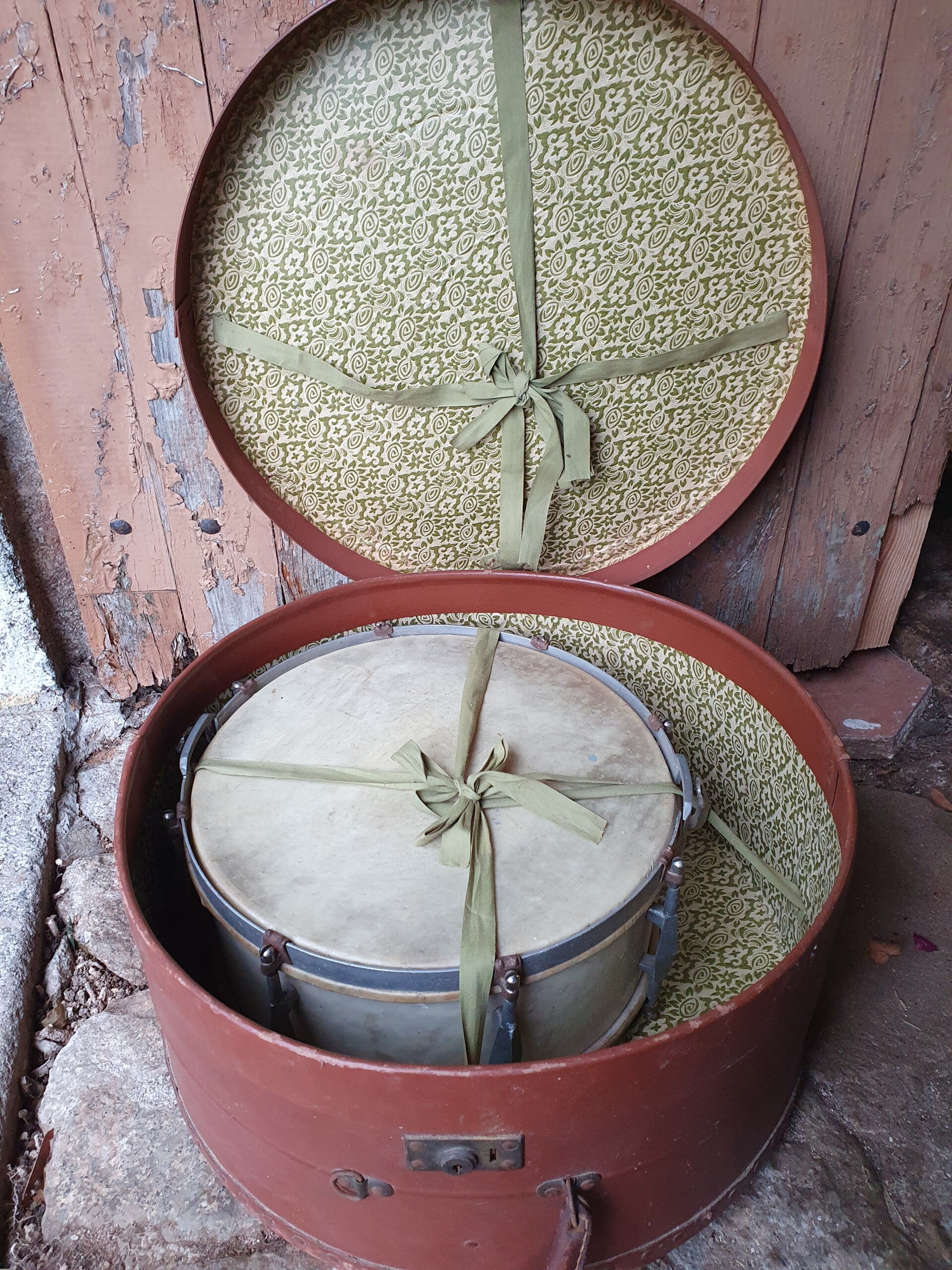Ancien tambour de fanfare militaire dans son étui d'origine, belle pièce à décorer, voir photos. Le dos est endommagé, mais on ne le voit pas de face.