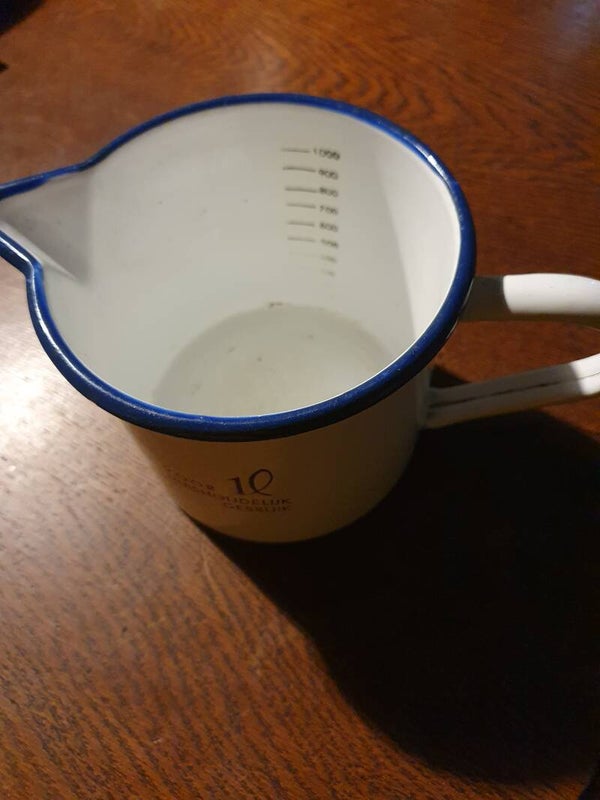 Vintage wit emaille litermaat met de sierlijke blauwe tekst "1 L voor huishoudelijk gebruik¨. De kan heeft een blauwe rand en binnenin een maatverdeling in deciliters
