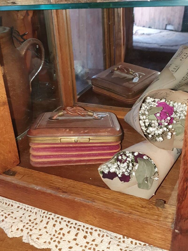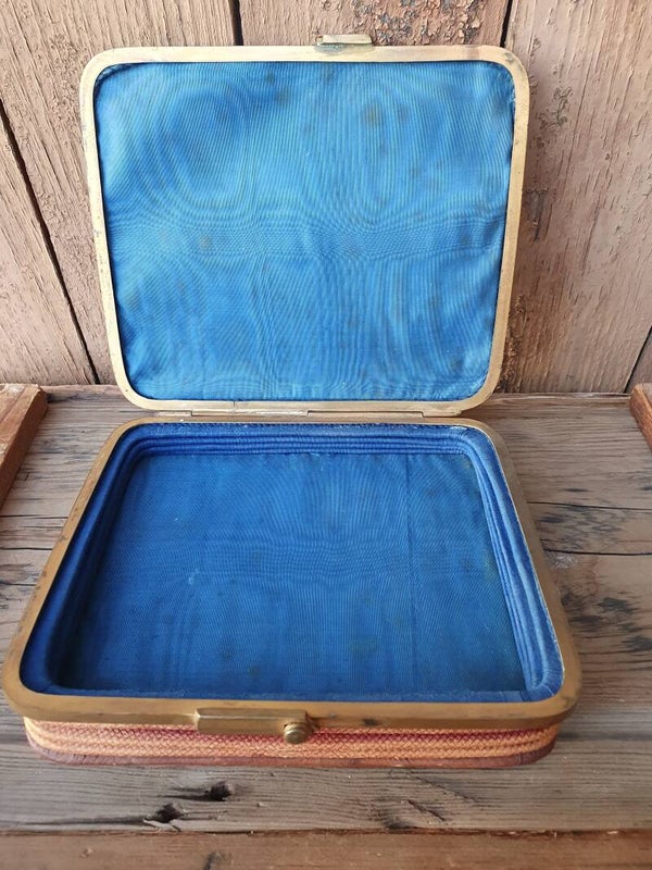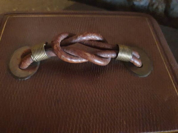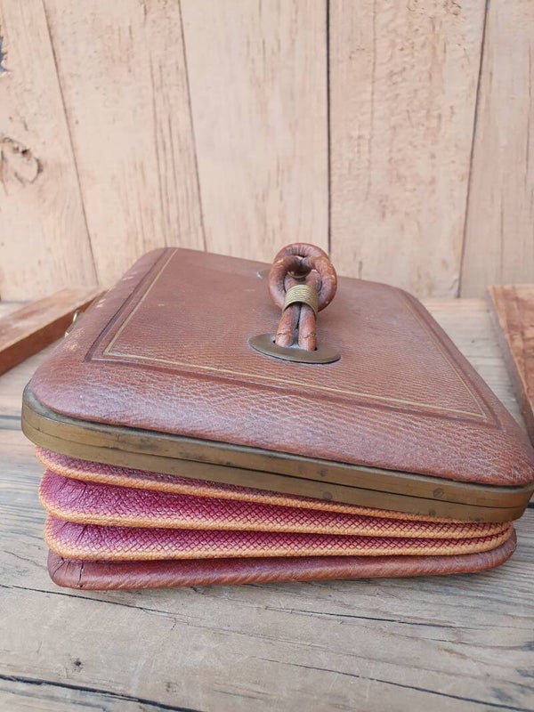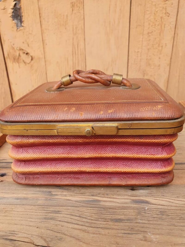 Zeer zeldzaam fijn "letherette" engels zakdoeken of brieven tasje, waar meer in kan dan je denkt: het heeft namelijk een harmonica vorm, waardoor de inhoud vele malen vergroot kan worden! Echt bijzonder! Let op de mooie handgreep knoop bovenop en de messing beugel en sluiting. Het tasje heeft een koningsblauwe moire stoffen voering. Oorspronkelijk bordeauxrood, nu verkleurd naar bruin. Echt iets speciaals voor de liefhebber. Het tasje meet 17 x 14 x 3 tot bijna 8 cm uitgevouwen.