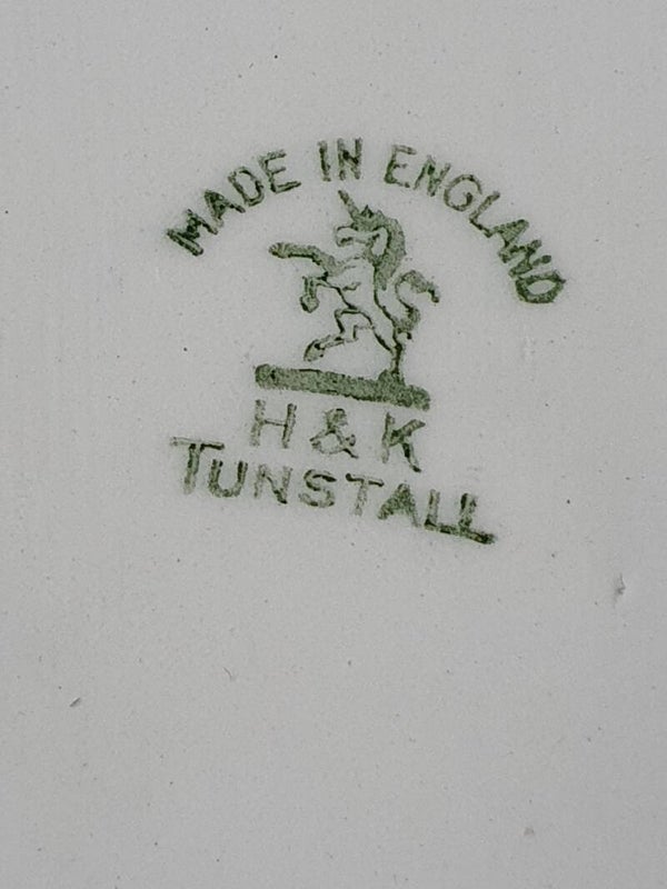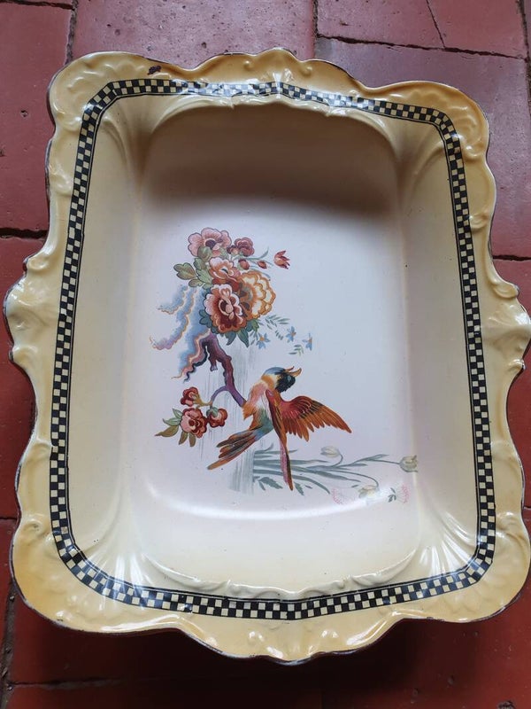 Fraaie serveerschaal gemerkt Hollinshead & Kirkham uit Burslem in Staffordshire, Engelnad en gemaakt tussen 1900 en 1924. De schaal is mooi van vorm en heeft een kleurige afbeelding van een vogel en diverse bloemen. Geen beschadigingen.